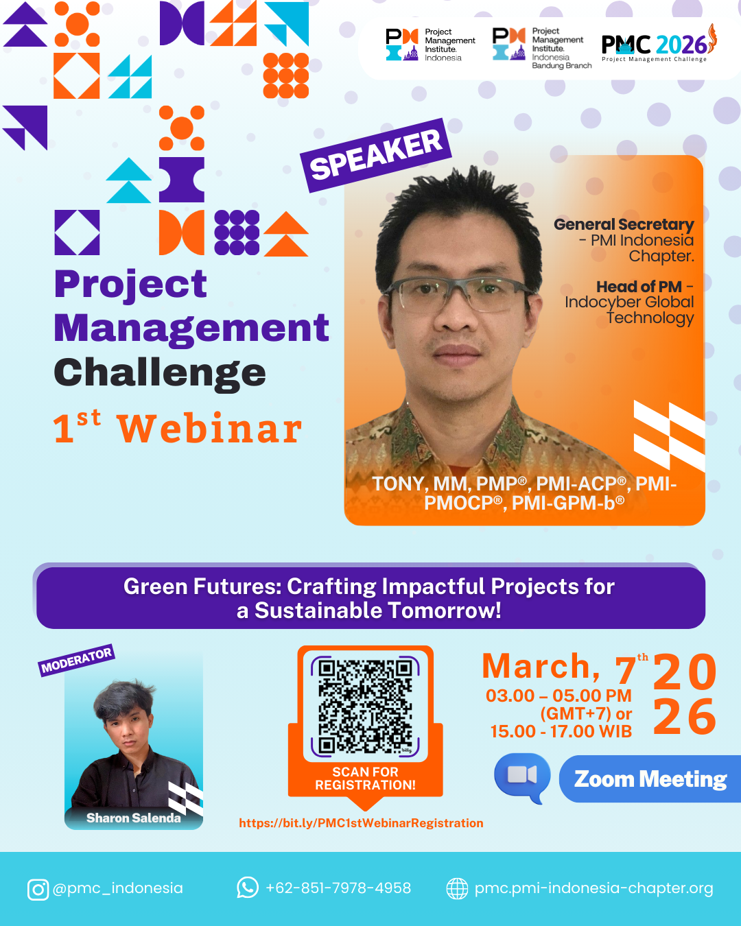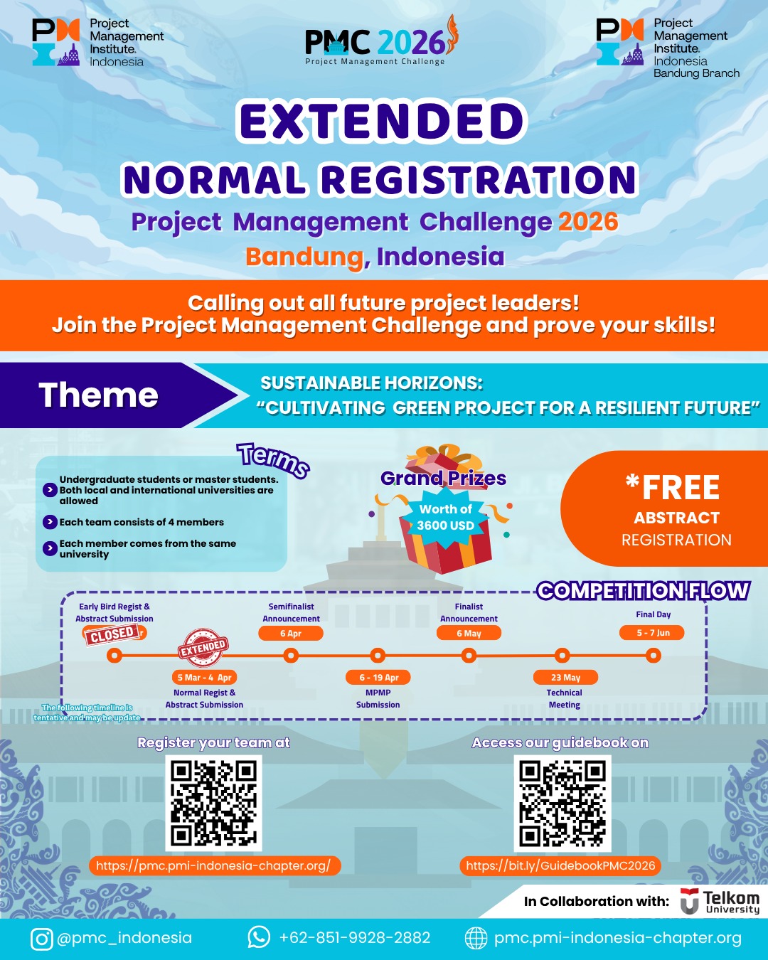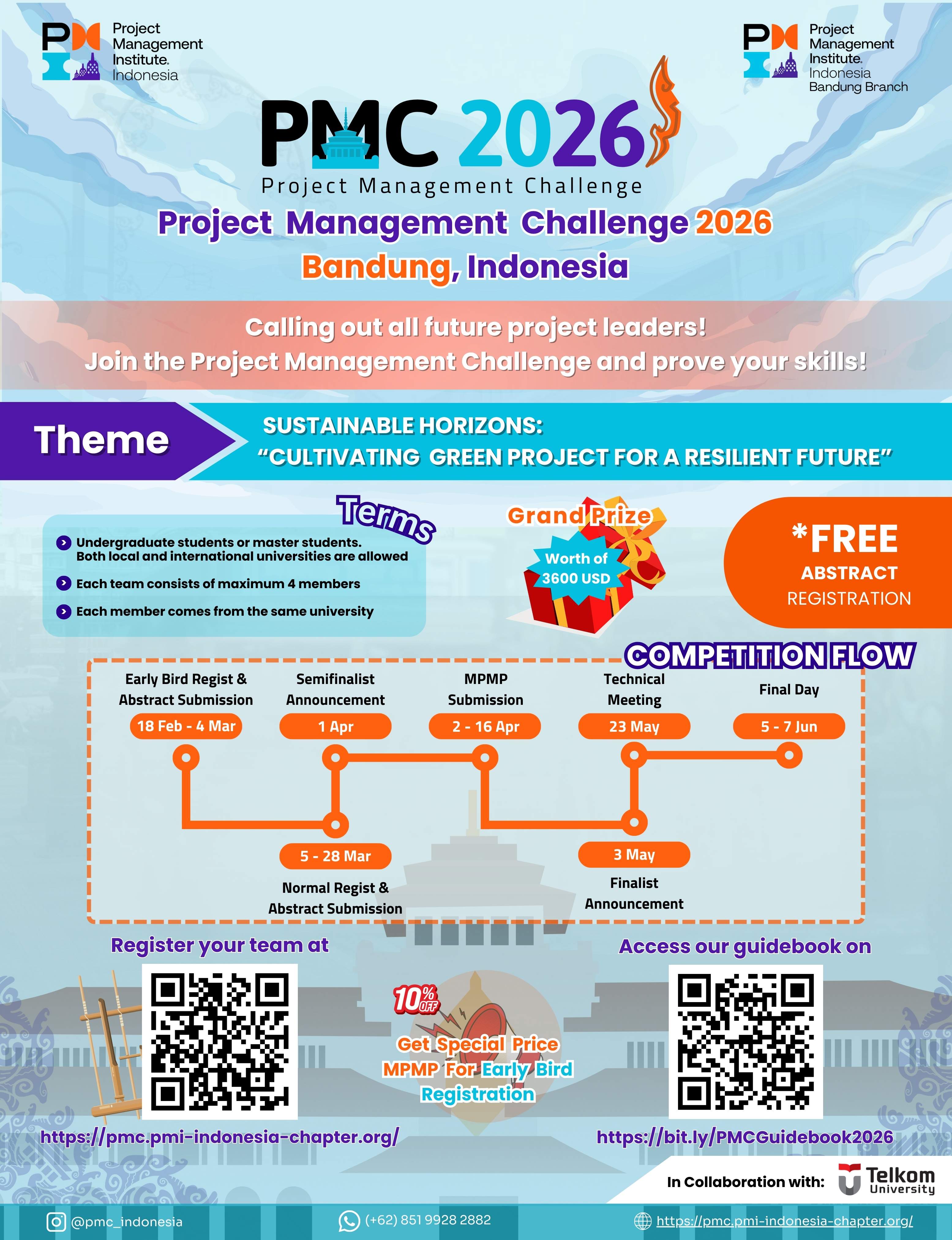Project Management Challenge 2026 (PMC 2026) is PMI Indonesia Chapter annual event, and it supports PMI Indonesia policy to play a role in the global existence of project management in the academic segment. PMC 2026 is a kind of bootcamp for university students which aims at nurturing youth generations to become future leaders and increasing awareness of the importance of project management, especially in the Asia Pacific region. The PMC 2026 that will be held in Bandung is expected to maintain their world class project management competition.